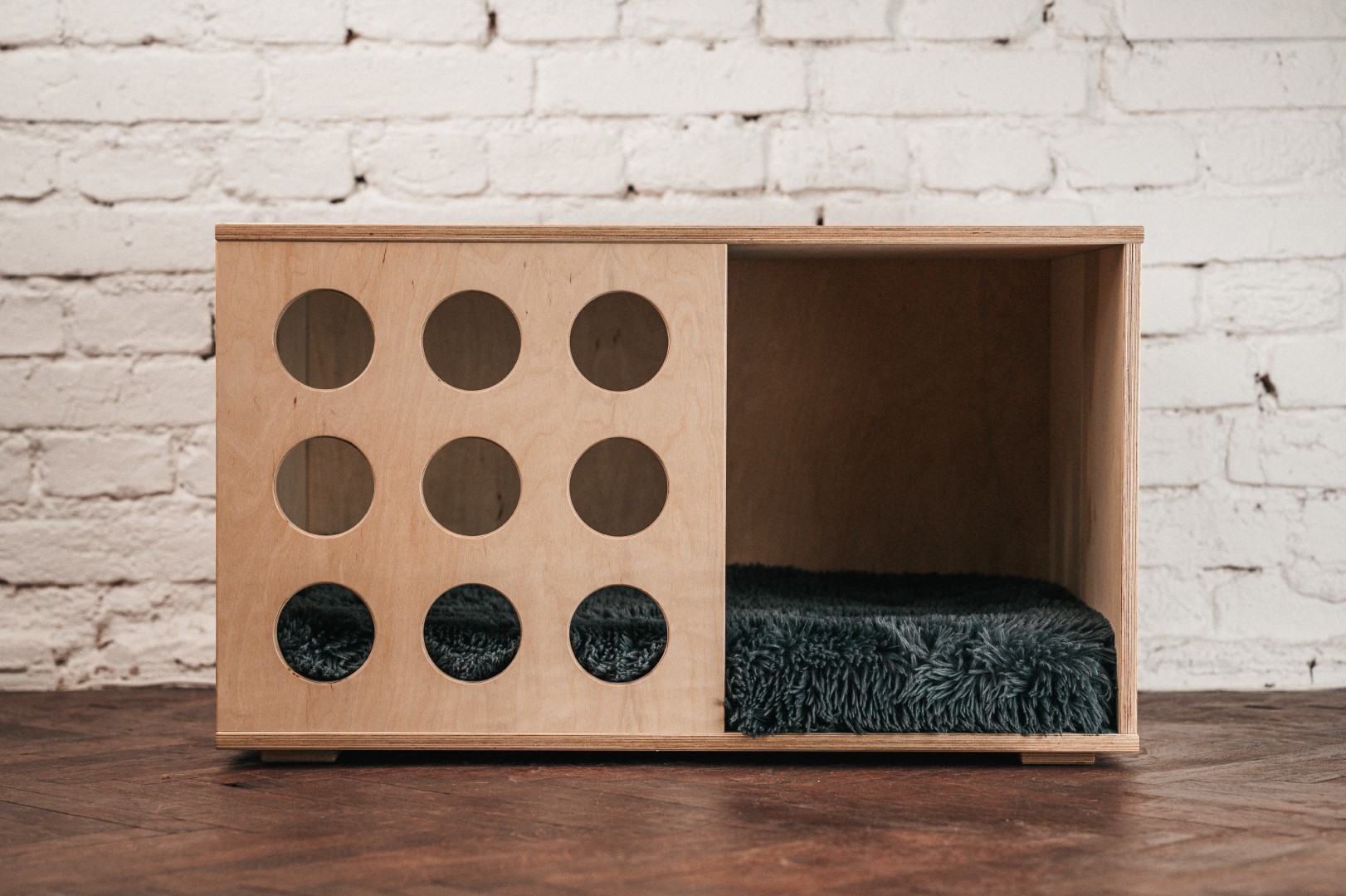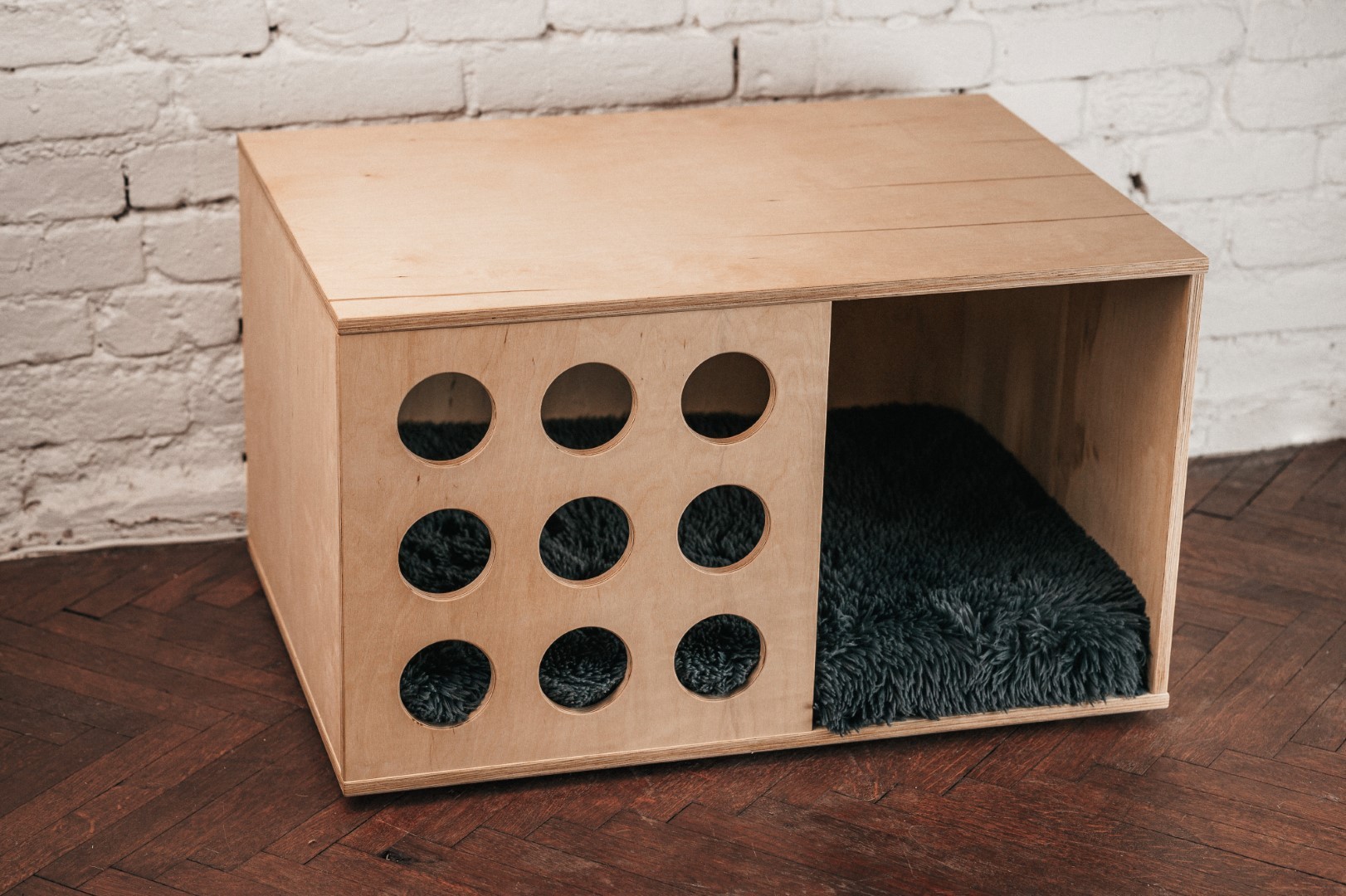 Představujeme vám naši designovou interiérovou psí či kočičí boudu, která není pouze stylovým úkrytem pro vašeho chlupatého přítele, ale zároveň slouží jako elegantní noční stolek. Tato unikátní a ručně vyráběná boudu je vyrobena z kvalitní překližky, což zaručuje pevnost a trvanlivost.